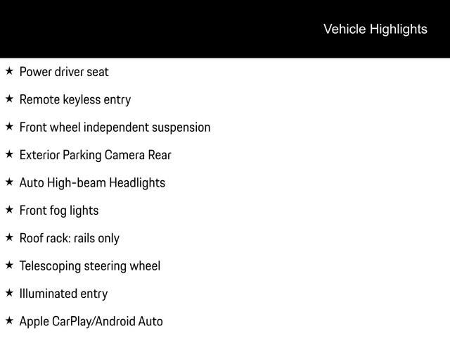Graphite Cloth, Apple CarPlay/Android Auto, Auto High-beam Headlights, Exterior Parking Camera Rear, Front Bucket Seats, Front fog lights, Front wheel independent suspension, Illuminated entry, Power driver seat, Remote keyless entry, Roof rack: rails only, Telescoping steering wheel.