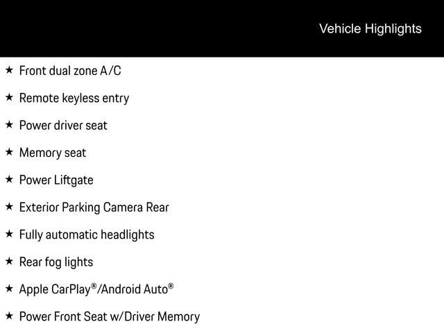 4-Way Lumbar Support, Apple CarPlay®/Android Auto®, Exterior Parking Camera Rear, Front dual zone A/C, Fully automatic headlights, Heated Front Bucket Seats, Memory seat, Power driver seat, Power Front Seat w/Driver Memory, Power Liftgate, Rear fog lights, Remote keyless entry.