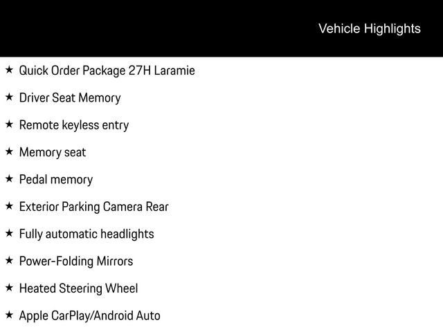 Apple CarPlay/Android Auto, Driver Seat Memory, Exterior Parking Camera Rear, Fully automatic headlights, Heated Steering Wheel, Memory seat, Pedal memory, Power-Folding Mirrors, Quick Order Package 27H Laramie, Remote keyless entry.