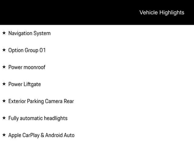 Gray Leather, Apple CarPlay & Android Auto, Exterior Parking Camera Rear, Fully automatic headlights, Navigation System, Option Group 01, Power Liftgate, Power moonroof.