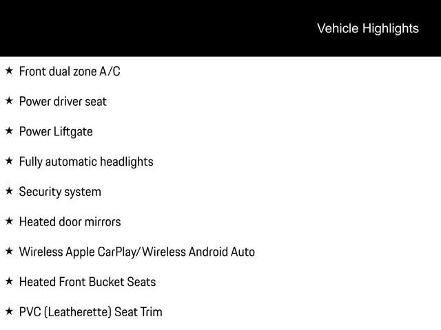 9-Speed Automatic, Front dual zone A/C, Fully automatic headlights, Heated door mirrors, Heated Front Bucket Seats, Power driver seat, Power Liftgate, PVC (Leatherette) Seat Trim, Security system, Wireless Apple CarPlay/Wireless Android Auto.